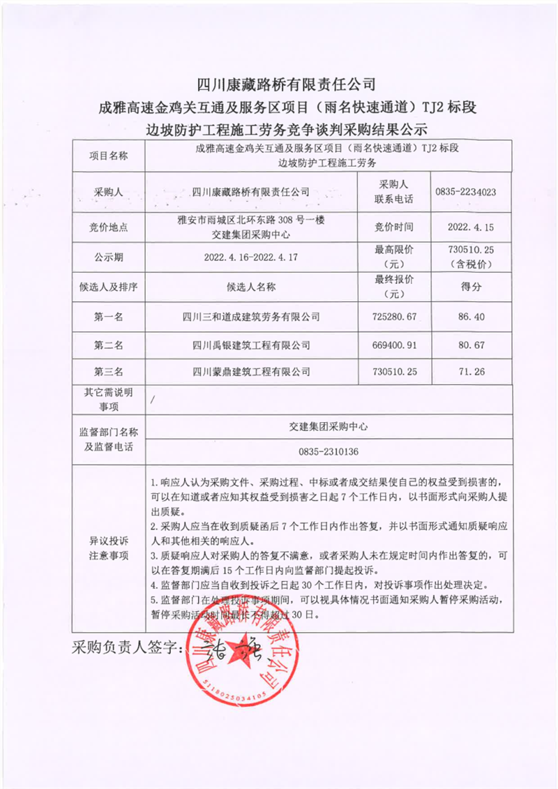 四川康藏路橋有限責(zé)任公司成雅高速金雞關(guān)互通及服務(wù)區(qū)項(xiàng)目(雨名快速通道)TJ2標(biāo)段邊坡防護(hù)工程施工勞務(wù)競(jìng)爭(zhēng)談判采購結(jié)果公示
