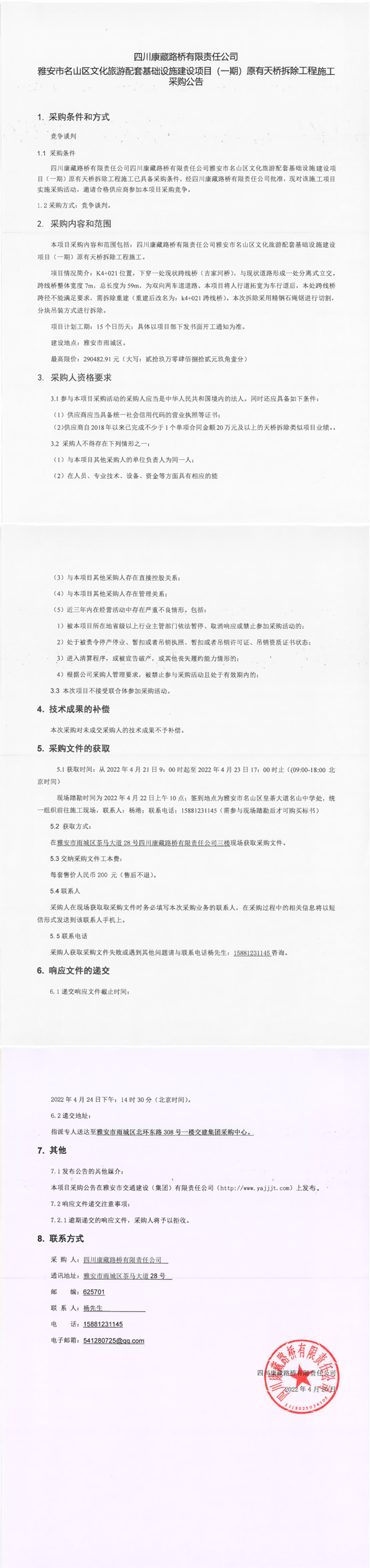 四川康藏路橋有限責(zé)任公司雅安市名山區(qū)文化旅游配套基礎(chǔ)設(shè)施建設(shè)項(xiàng)目(一期)原有天橋拆除工程施工采購公告
