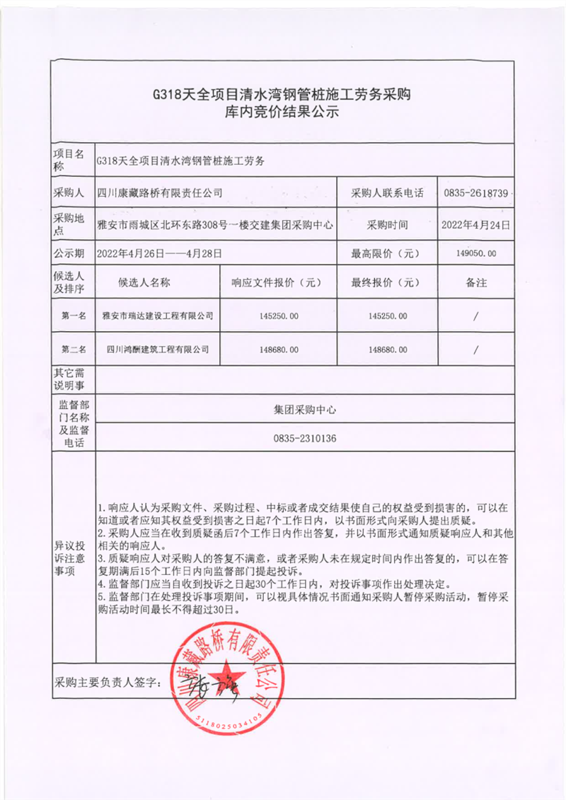 四川康藏路橋有限責(zé)任公司G318天全項(xiàng)目清水灣鋼管樁施工勞務(wù)采購庫內(nèi)競價結(jié)果公示