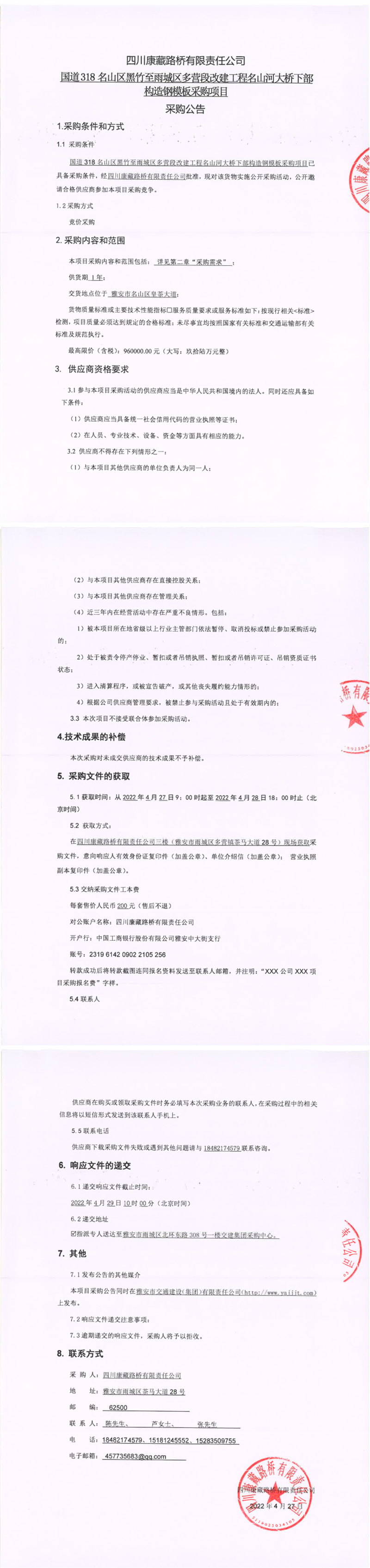 四川康藏路橋有限責任公司國道318名山區(qū)黑竹至雨城區(qū)多營段改建工程名山河大橋下部構造鋼模板采購項目采購公告