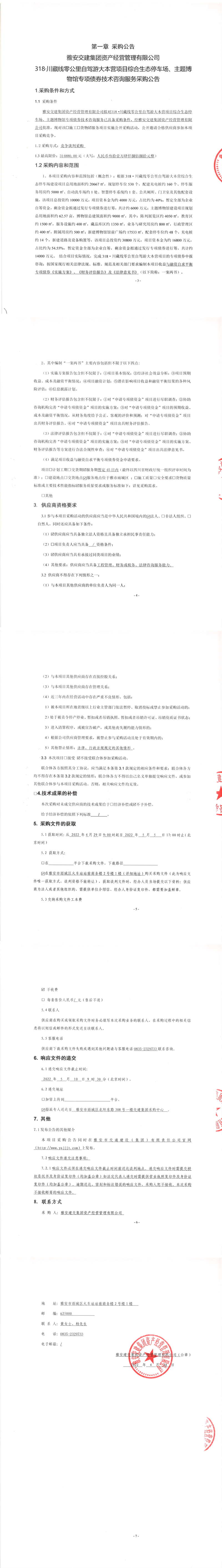 雅安交建集團資產(chǎn)經(jīng)營管理有限公司318.川藏線零公里自駕游大本營項目綜合生態(tài)停車場、主題博物館專項債券技術(shù)咨詢服務(wù)采購公告