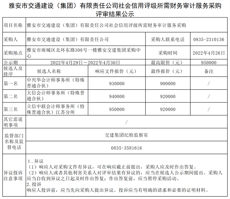 雅安市交通建設(shè)(集團(tuán))有限責(zé)任公司社會(huì)信用評(píng)級(jí)所需財(cái)務(wù)審計(jì)服務(wù)采購(gòu)評(píng)審結(jié)果公示