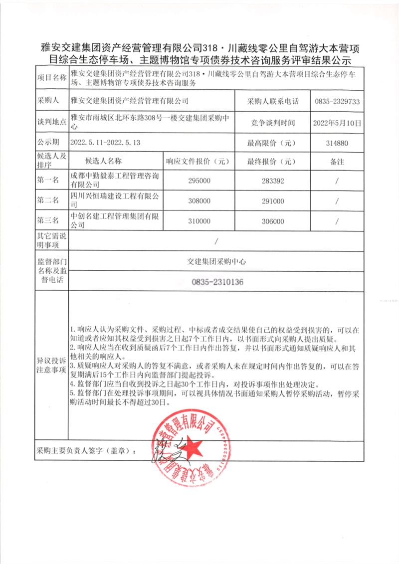 雅安交建集團資產(chǎn)經(jīng)營管理有限公司318·川藏線零公里自駕游大本營項目綜合生態(tài)停車場、主題博物館專項債券技術(shù)咨詢服務(wù)評審結(jié)果公示