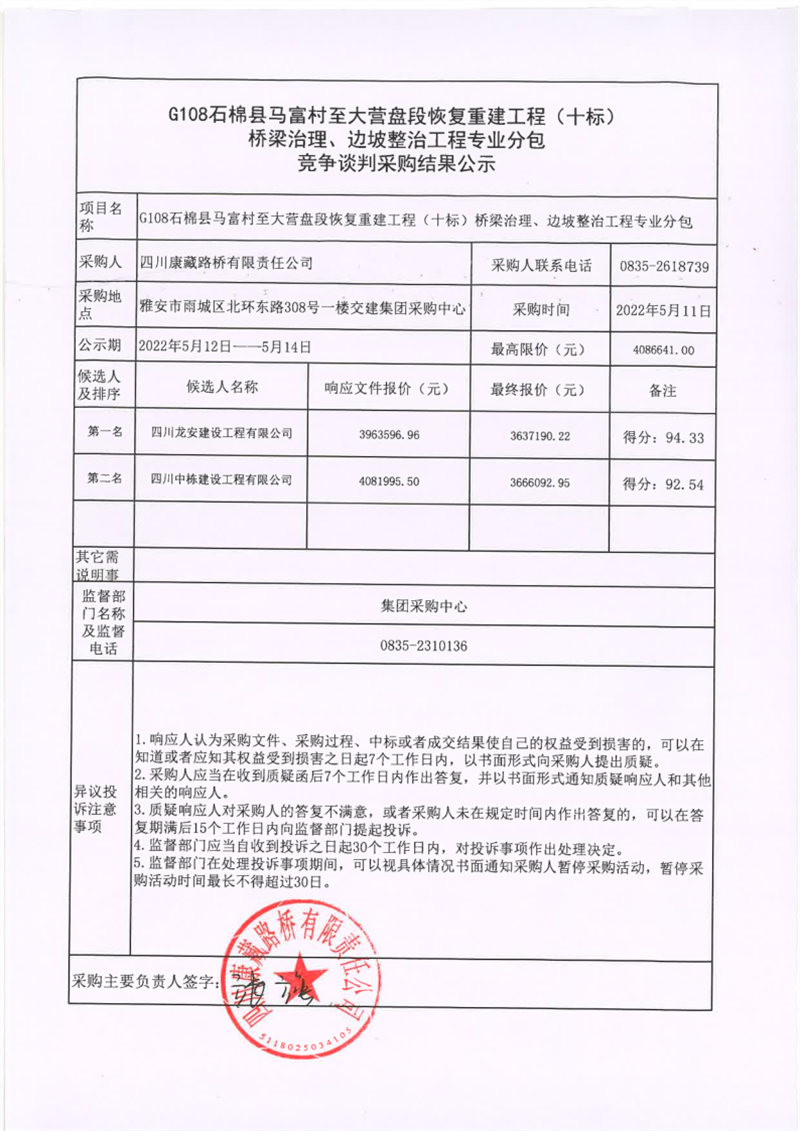 四川康藏路橋有限責任公司G108線石棉縣馬富村至大營盤段恢復重建工程(十標)橋梁治理、邊坡整治工程專業(yè)分包競爭談判采購結果公示
