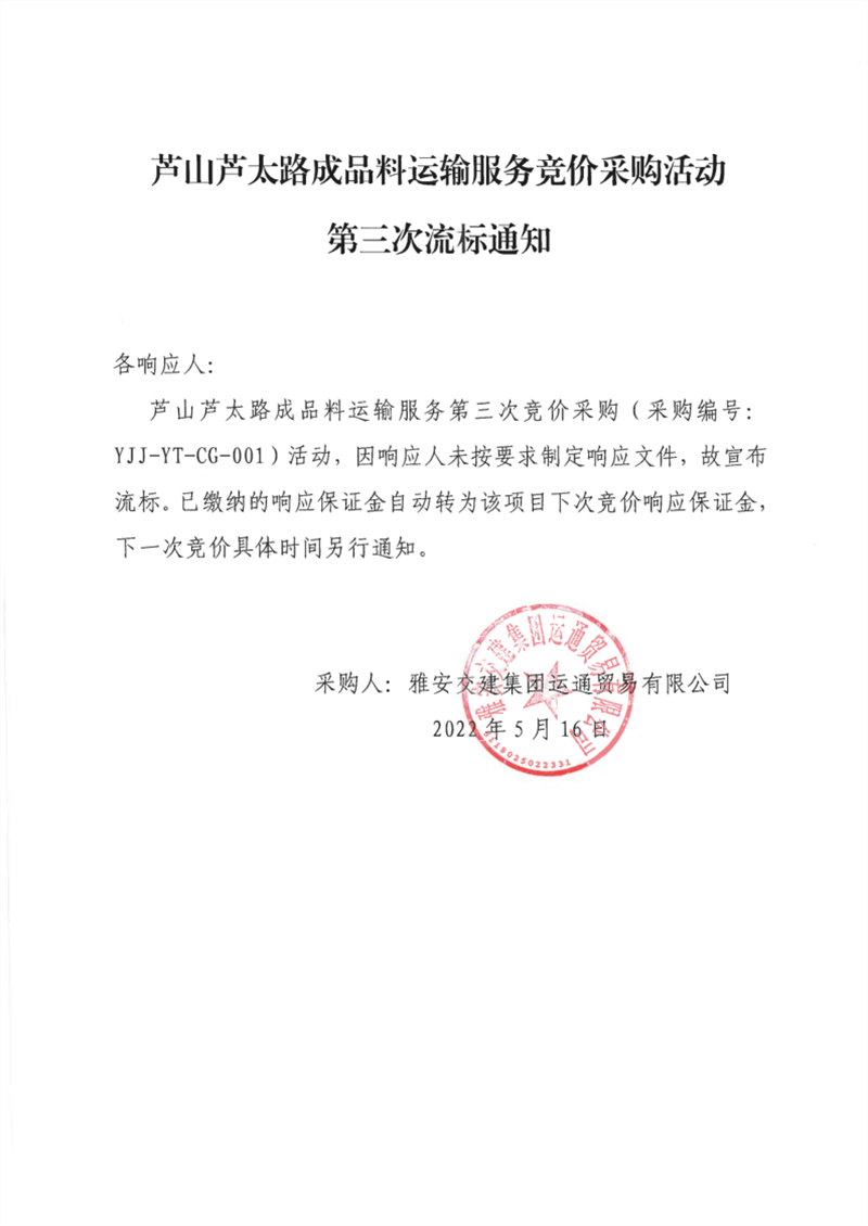 雅安交建集團(tuán)運(yùn)通貿(mào)易有限公司蘆山蘆太路成品料運(yùn)輸服務(wù)競價(jià)采購活動(dòng)第三次流標(biāo)通知