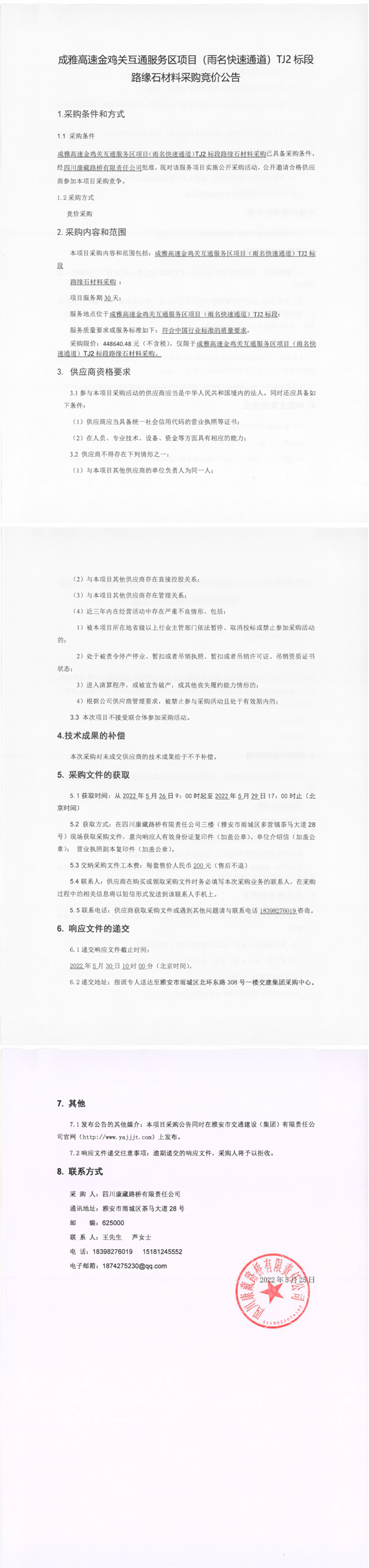 四川康藏路橋有限責(zé)任公司成雅高速金雞關(guān)互通服務(wù)區(qū)項目(雨名快速通道)TJ2標(biāo)段路緣石材料采購競價公告