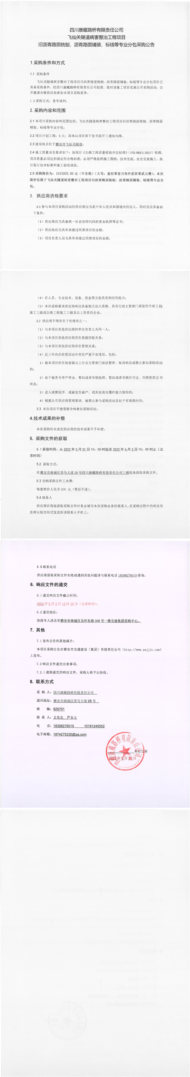 四川康藏路橋有限責任公司飛仙關隧道病害整治工程項目舊瀝青路面銑刨、瀝青路面鋪裝、標線等專業(yè)分包采購公告