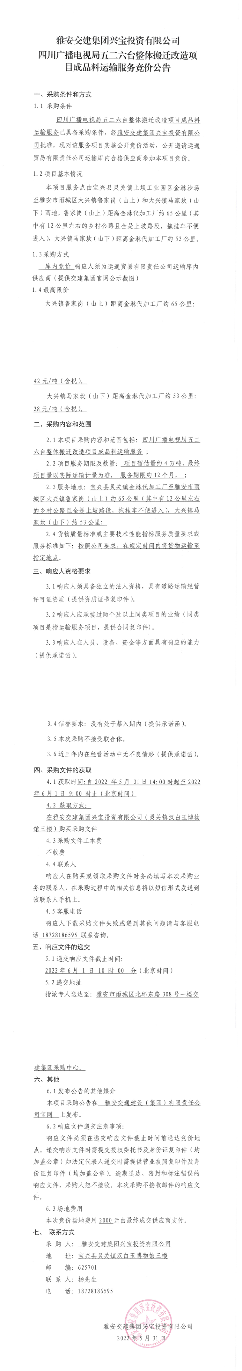雅安交建集團興寶投資有限公司四川廣播電視局五二六臺整體搬遷改造項目成品料運輸服務(wù)競價公告
