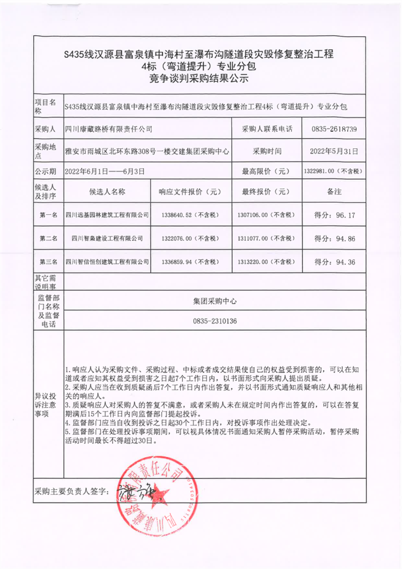 四川康藏路橋有限責(zé)任公司S435線漢源縣富泉鎮(zhèn)中海村至瀑布溝隧道段災(zāi)毀修復(fù)整治工程4標(biāo)(彎道提升)專業(yè)分包競爭談判采購結(jié)果公示