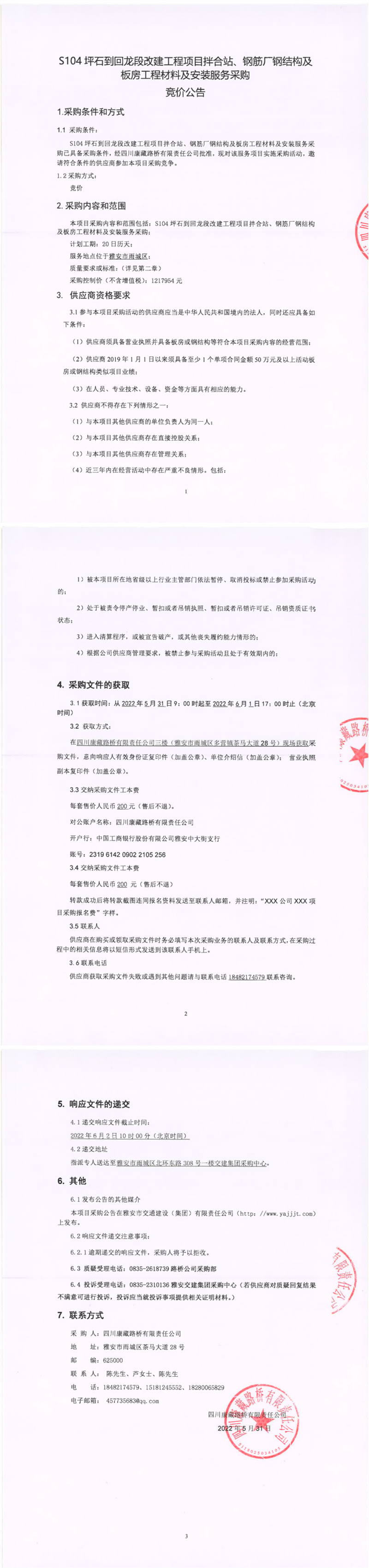 四川康藏路橋有限責任公司S104坪石到回龍段改建工程項目拌合站、鋼筋廠鋼結(jié)構(gòu)及板房工程材料及安裝服務采購競價公告