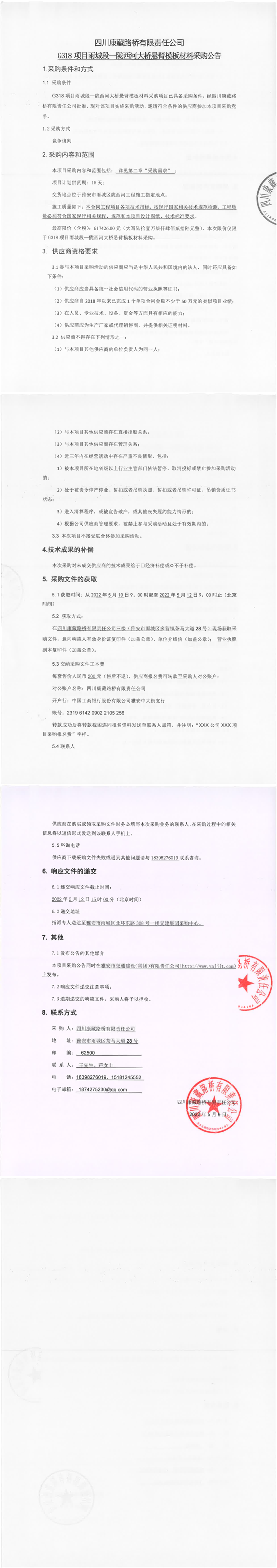 四川康藏路橋有限責(zé)任公司G318項(xiàng)目雨城段-隴西河大橋懸臂模板材料采購公告