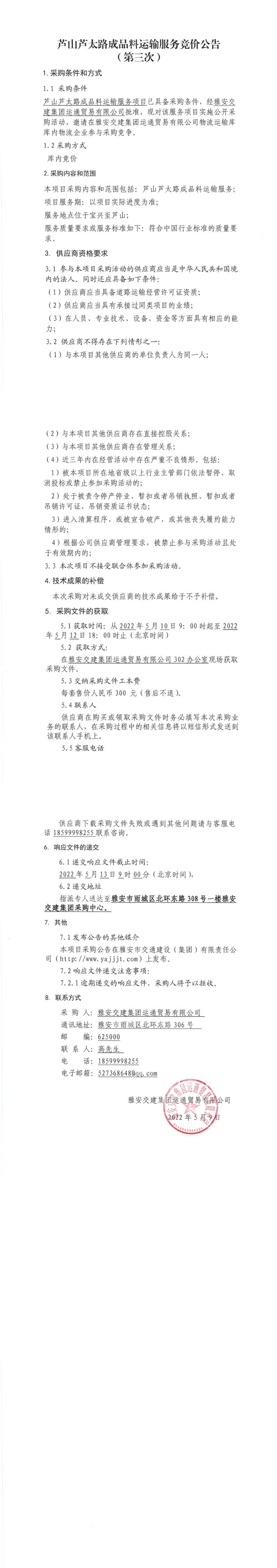 雅安交建集團運通貿(mào)易有限公司蘆山蘆太路成品料運輸服務(wù)競價公告(第三次)