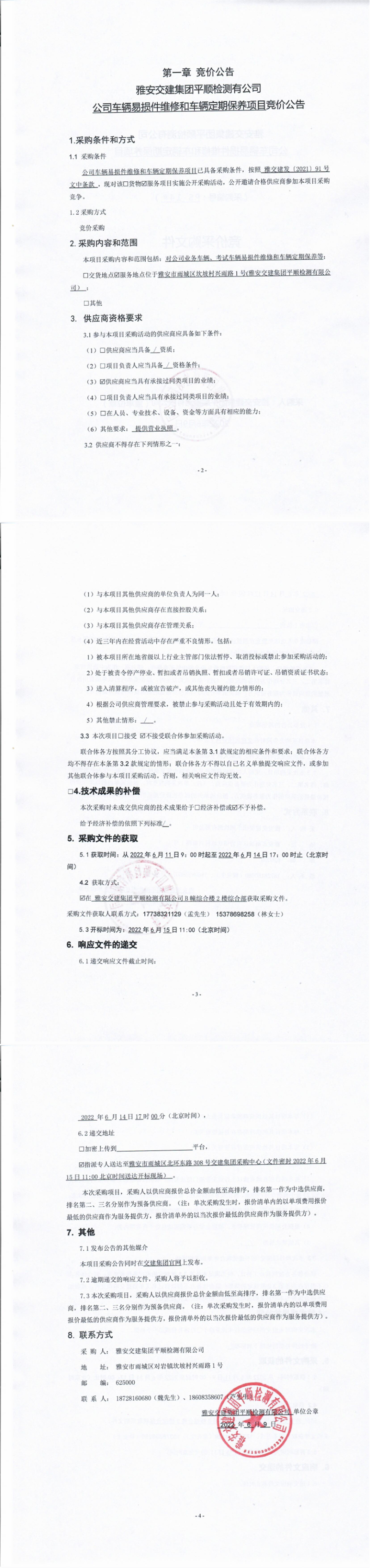 雅安交建集團(tuán)平順檢測(cè)有限公司公司車(chē)輛易損件維修和車(chē)輛定期保養(yǎng)項(xiàng)目競(jìng)價(jià)公告