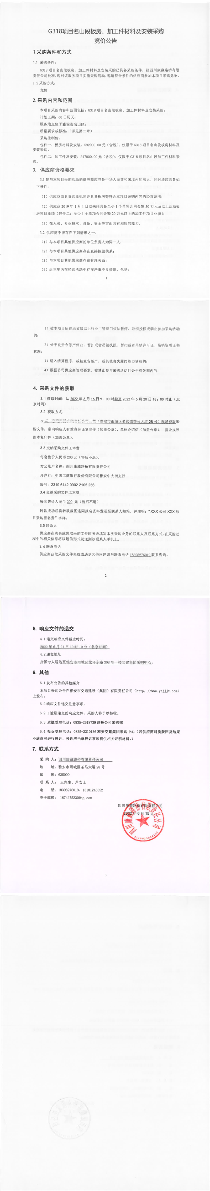 四川康藏路橋有限責任公司G318項目名山段板房、加工件材料及安裝采購競價公告