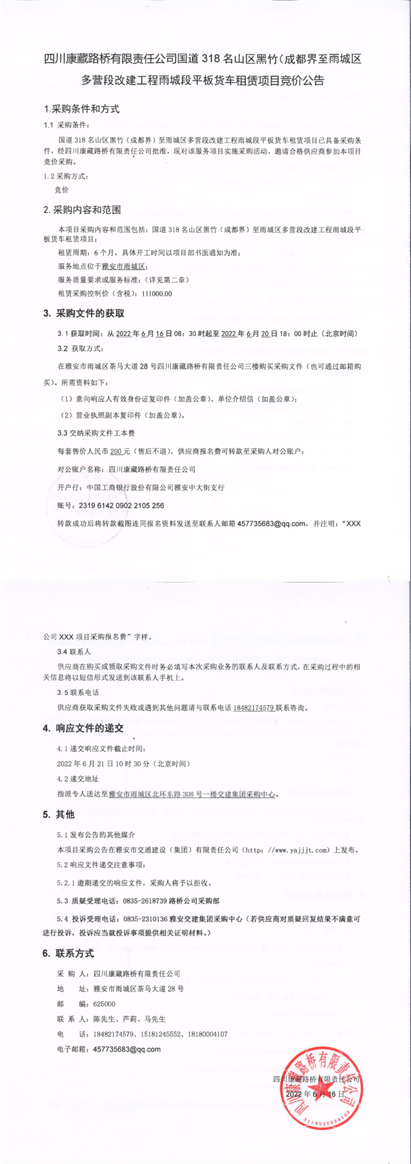 四川康藏路橋有限責任公司國道318名山區(qū)黑竹(成都界)至雨城區(qū)多營段改建工程雨城段平板貨車租賃項目競價公告