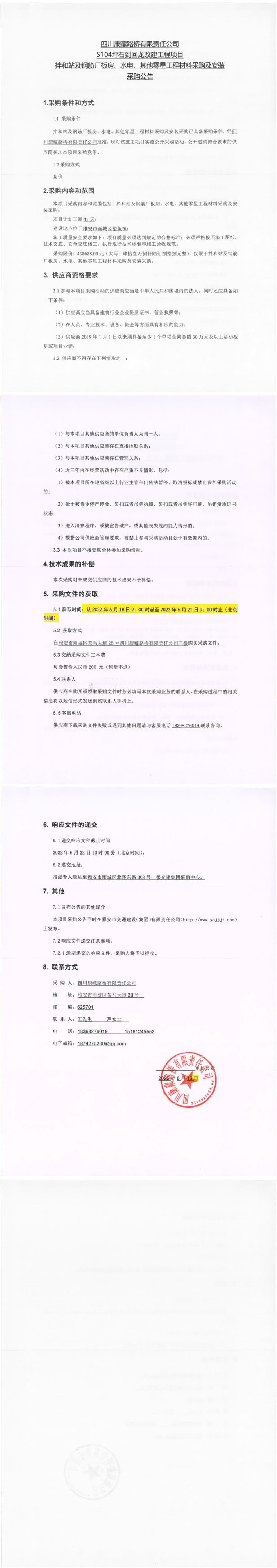 四川康藏路橋有限責(zé)任公司S104坪石到回龍改建工程項(xiàng)目拌和站及鋼筋廠板房、水電、其他零星工程材料采購及安裝采購公告