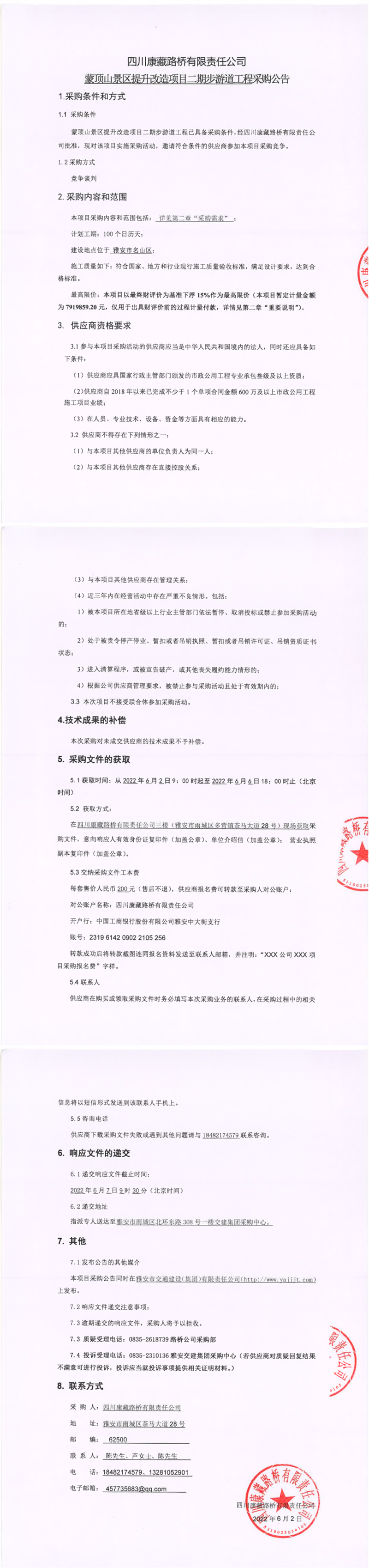 四川康藏路橋有限責任公司蒙頂山景區(qū)提升改造項目二期步游道工程采購公告