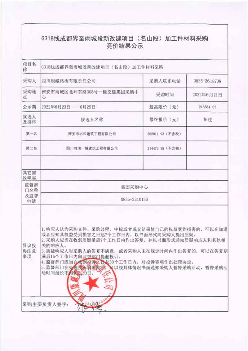 四川康藏路橋有限責(zé)任公司G318線成都界至雨城段新改建項(xiàng)目(名山段)加工件材料采購(gòu)競(jìng)價(jià)結(jié)果公示