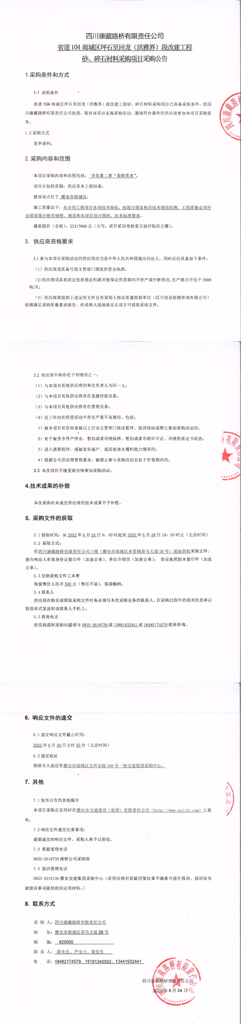 四川康藏路橋有限責(zé)任公司省道104雨城區(qū)坪石至回龍(洪雅界)段改建工程砂、碎石材料采購項目采購公告