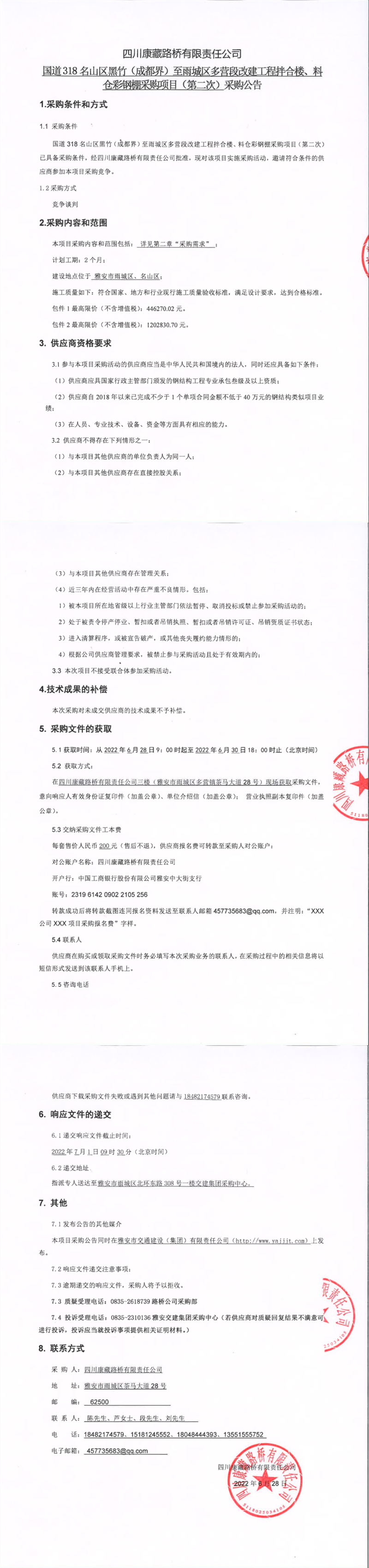 四川康藏路橋有限責(zé)任公司國道318名山區(qū)黑竹(成都界)至雨城區(qū)多營段改建工程拌合樓、料倉彩鋼棚采購項(xiàng)目(第二次)采購公告