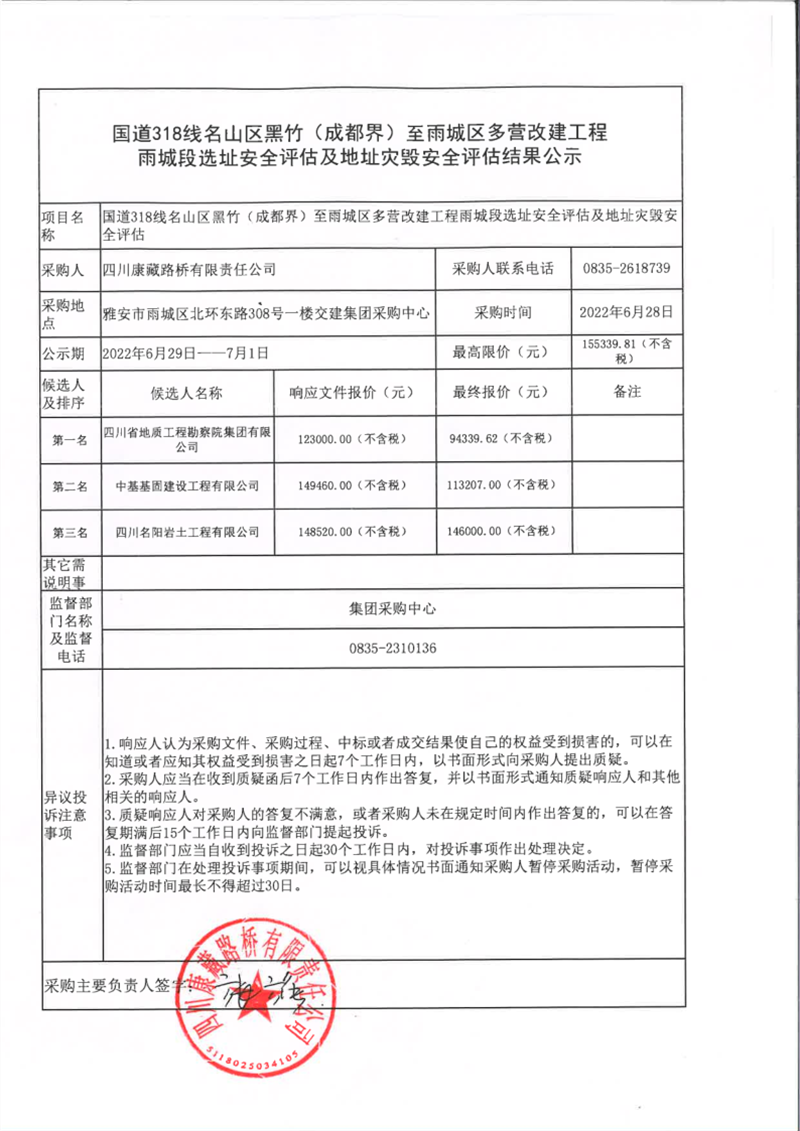 四川康藏路橋有限責任公司國道318名山區(qū)黑竹(成都界)至雨城區(qū)多營段改建工程雨城段選址安全評估及地址災毀安全評估結果公示