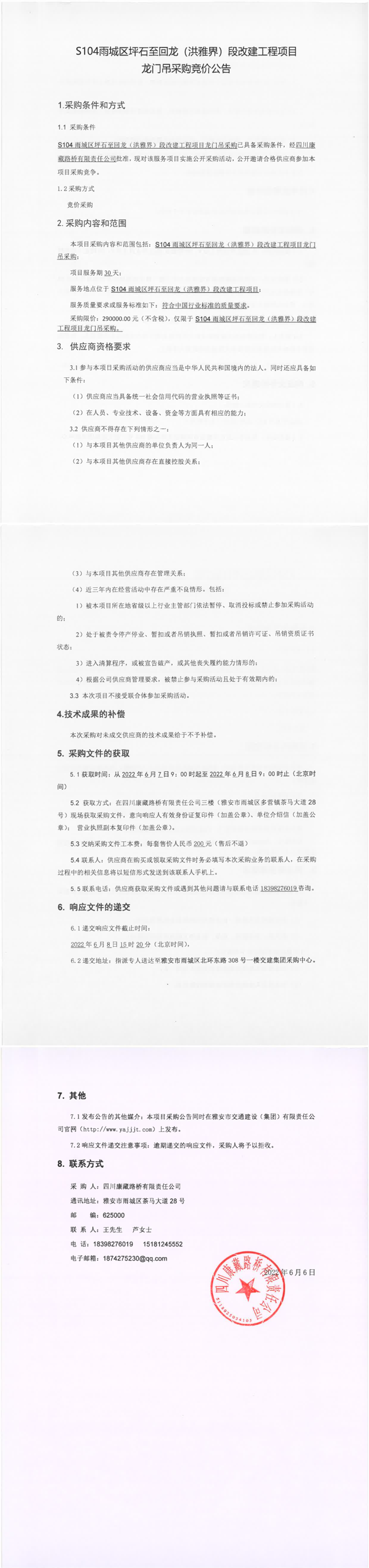 四川康藏路橋有限責任公司S104雨城區(qū)坪石至回龍(洪雅界)段改建工程項目龍門吊采購競價公告