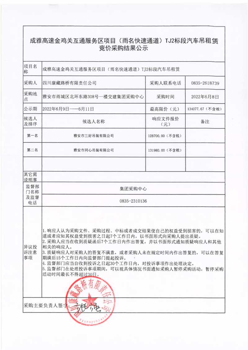 四川康藏路橋有限責(zé)任公司成雅高速金雞關(guān)互通服務(wù)區(qū)項目(雨名快速通道)TJ2標段汽車吊租賃競價采購結(jié)果公示