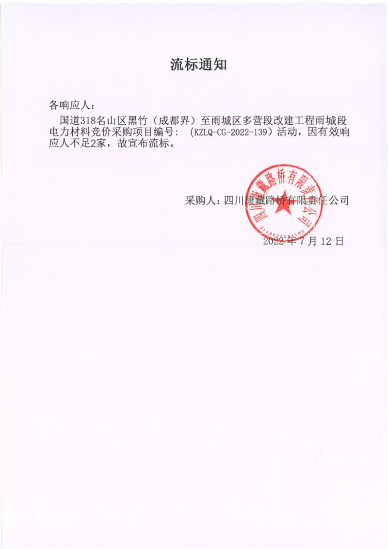 四川康藏路橋有限責(zé)任公司國道318名山區(qū)黑竹(成都界)至雨城區(qū)多營段改建工程雨城段電力材料競價采購項(xiàng)目流標(biāo)通知