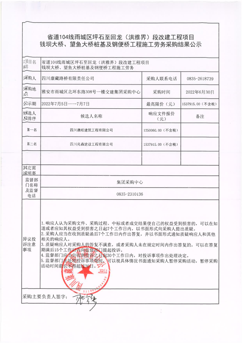 四川康藏路橋有限責(zé)任公司省道104線雨城區(qū)坪石至回龍(洪雅界)段改建工程項目錢壩大橋、望魚大橋樁基及鋼便橋工程施工勞務(wù)采購結(jié)果公示