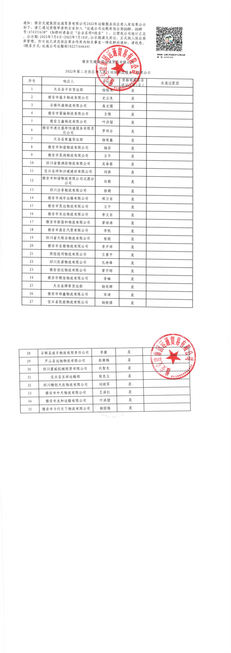 雅安交建集團運通貿(mào)易有限公司2022年第二次供應商入庫(運輸物流服務)結果公示