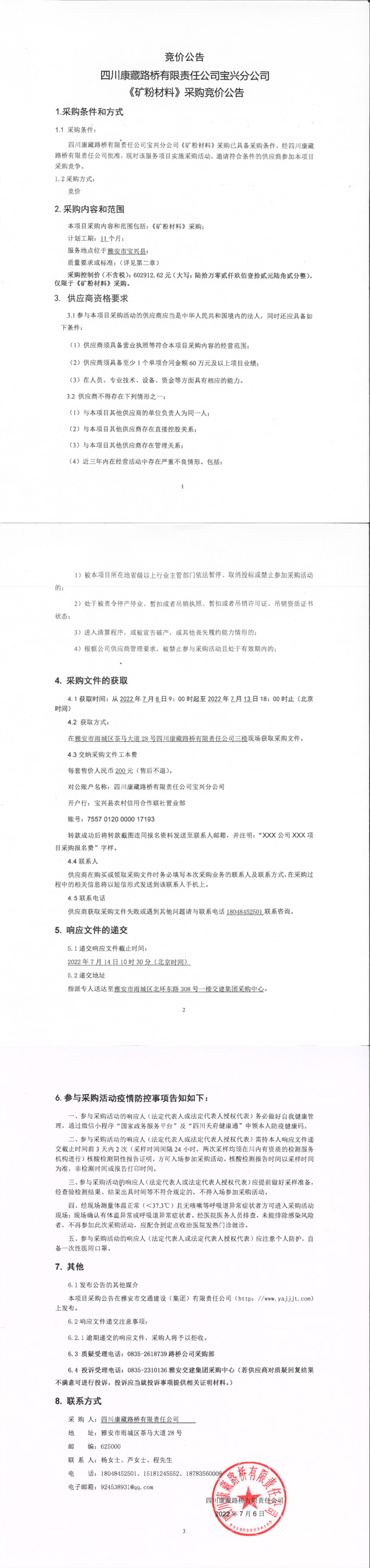 四川康藏路橋有限責(zé)任公司寶興分公司礦粉材料采購競價公告