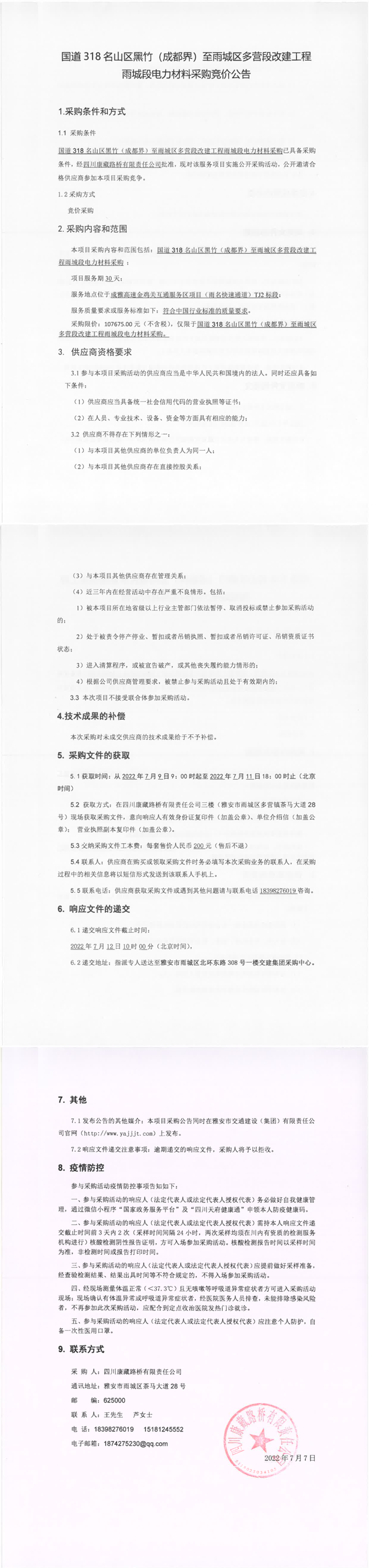 四川康藏路橋有限責(zé)任公司國(guó)道318名山區(qū)黑竹(成都界)至雨城區(qū)多營(yíng)段改建工程雨城段電力材料采購(gòu)競(jìng)價(jià)公告