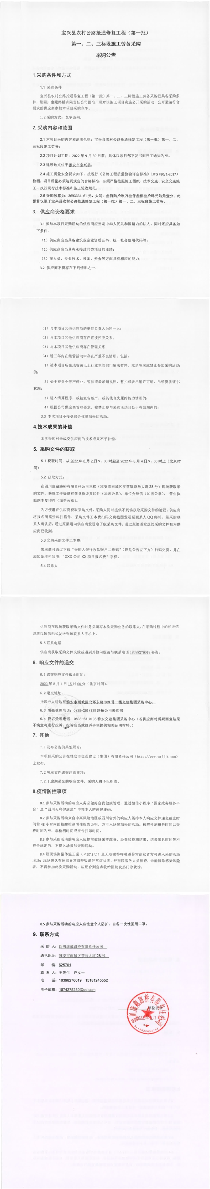 四川康藏路橋有限責(zé)任公司寶興縣農(nóng)村公路搶通修復(fù)工程(第一批)第一、二、三標(biāo)段施工勞務(wù)采購采購公告