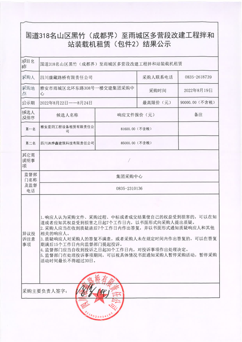 四川康藏路橋有限責(zé)任公司國(guó)道318名山區(qū)黑竹(成都界)至雨城區(qū)多營(yíng)段改建工程拌和站裝載機(jī)租賃(包件2)結(jié)果公示