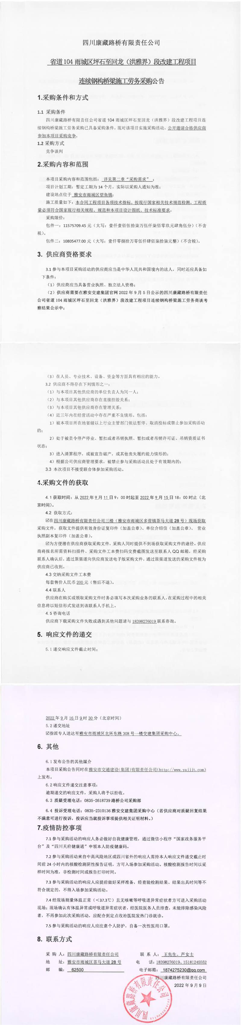 四川康藏路橋有限責(zé)任公司省道104雨城區(qū)坪石至回龍(洪雅界)段改建工程項目連續(xù)鋼構(gòu)橋梁施工勞務(wù)采購公告