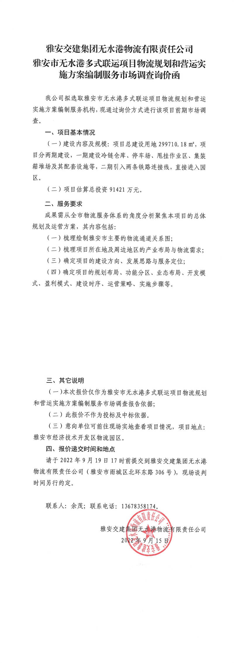 雅安交建集團(tuán)無(wú)水港物流有限責(zé)任公司雅安市無(wú)水港多式聯(lián)運(yùn)項(xiàng)目物流規(guī)劃和營(yíng)運(yùn)實(shí)施方案編制服務(wù)市場(chǎng)調(diào)查詢價(jià)函