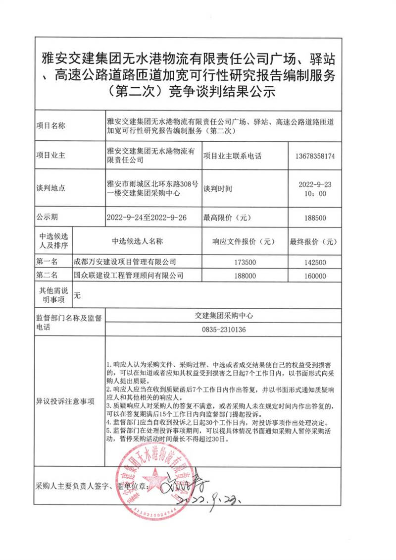 雅安交建集團無水港物流有限責任公司廣場、驛站、高速公路道路匝道加寬可行性研究報告編制服務(第二次)競爭談判結果公示