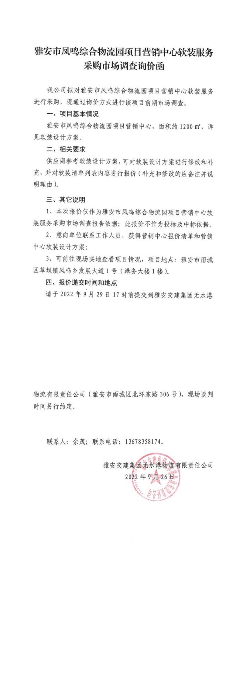 雅安交建集團(tuán)無水港物流有限責(zé)任公司雅安市鳳鳴綜合物流園項(xiàng)目營銷中心軟裝服務(wù)采購市場調(diào)查詢價(jià)函