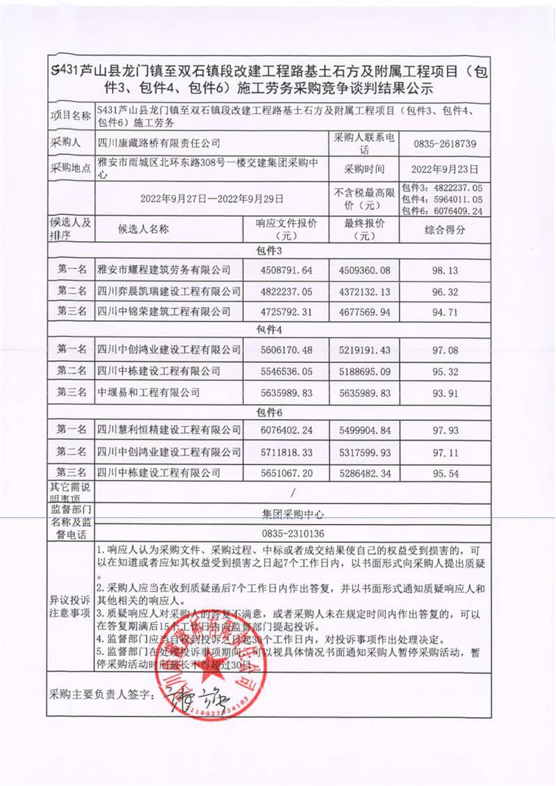 四川康藏路橋有限責任公司S431蘆山縣龍門鎮(zhèn)至雙石鎮(zhèn)段改建工程路基土石方及附屬工程項目(包件3、包件4、包件6)施工勞務采購競爭談判結果公示