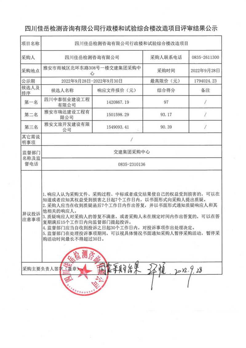 四川佳岳檢測(cè)咨詢有限公司行政樓和試驗(yàn)綜合樓改造項(xiàng)目評(píng)審結(jié)果公示