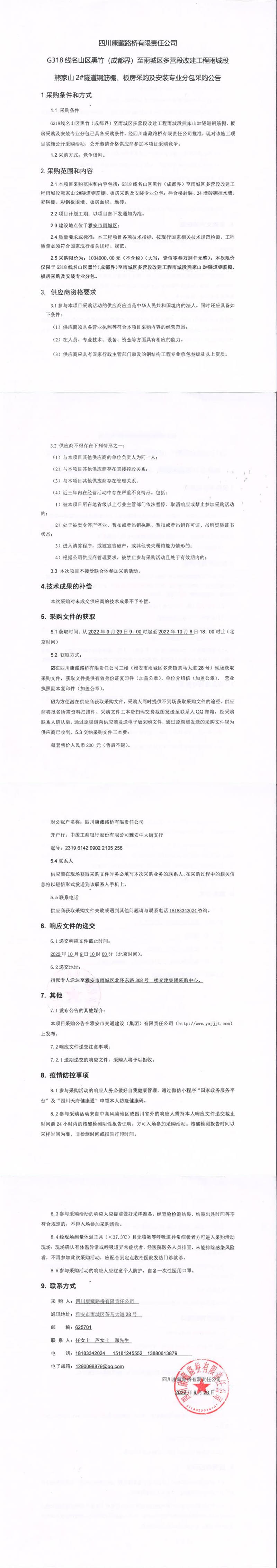 四川康藏路橋有限責(zé)任公司G318線名山區(qū)黑竹(成都界)至雨城區(qū)多營(yíng)段改建工程雨城段熊家山2#隧道鋼筋棚、板房采購(gòu)及安裝專(zhuān)業(yè)分包采購(gòu)公告