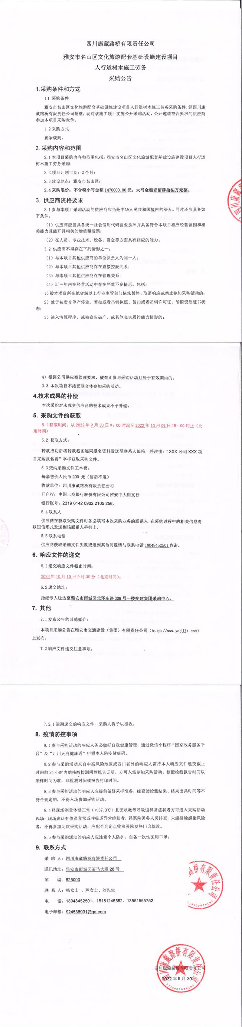 四川康藏路橋有限責任公司雅安市名山區(qū)文化旅游配套基礎設施建設項目人行道樹木施工勞務采購公告