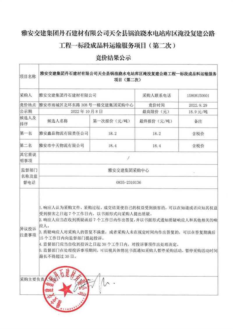 雅安交建集團(tuán)丹石建材有限公司天全縣鍋浪蹺水電站庫區(qū)淹沒復(fù)建公路工程一標(biāo)段成品料運(yùn)輸服務(wù)項(xiàng)目(第二次)競價結(jié)果公示