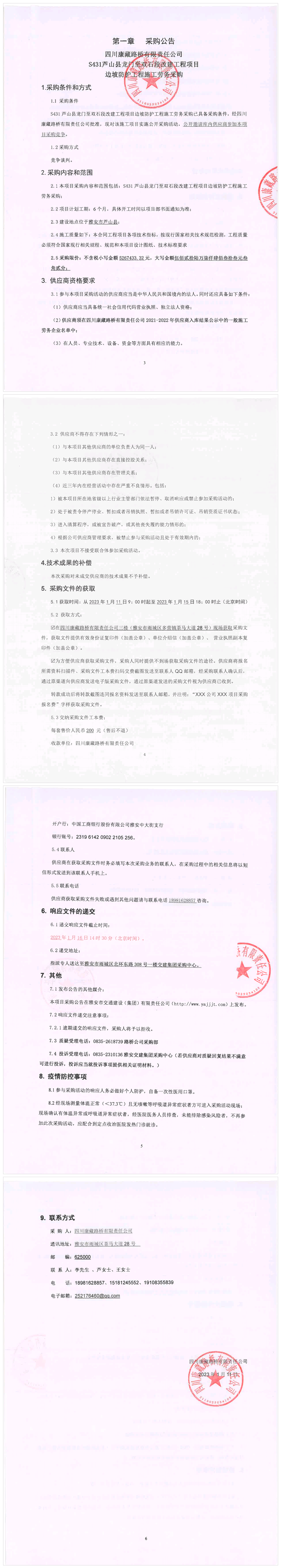 四川康藏路橋有限責任公司S431蘆山縣龍門至雙石段改建工程項目邊坡防護工程施工勞務采購競爭談判結(jié)果公示