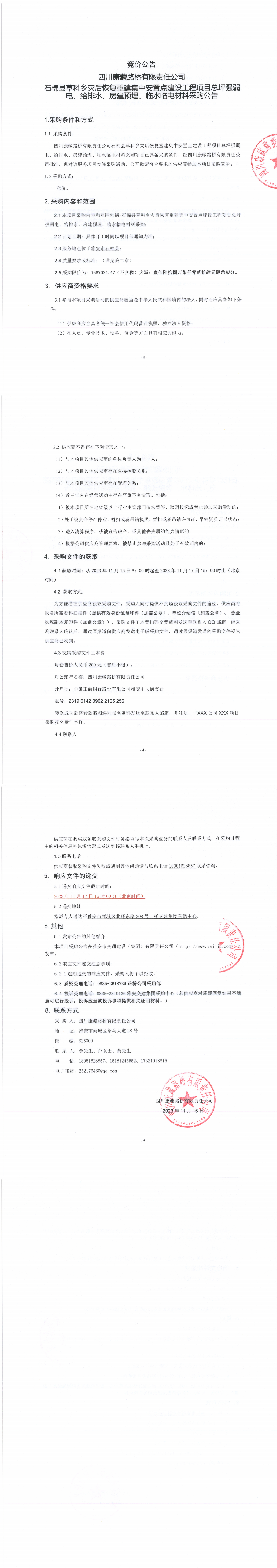 四川康藏路橋有限責(zé)任公司石棉縣草科鄉(xiāng)災(zāi)后恢復(fù)重建集中安置點(diǎn)建設(shè)工程項(xiàng)目總坪強(qiáng)弱電、給排水、房建預(yù)埋、臨水臨電材料采購(gòu)公告