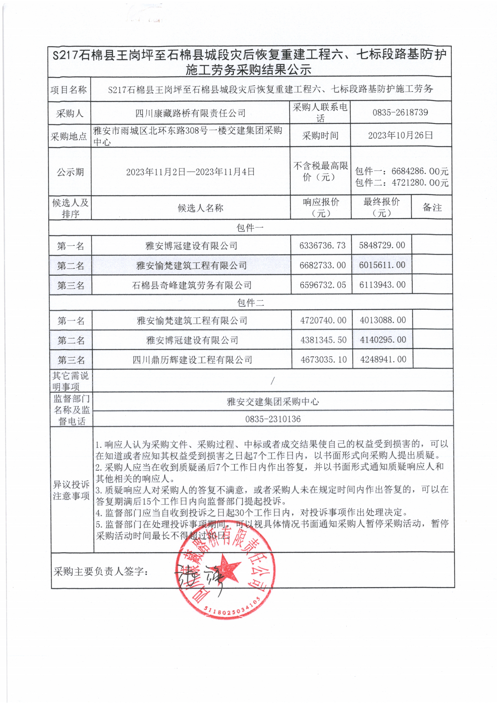 四川康藏路橋有限責(zé)任公司S217石棉縣王崗坪至石棉縣城段災(zāi)后恢復(fù)重建工程六、七標(biāo)段路基防護(hù)施工勞務(wù)采購結(jié)果公示