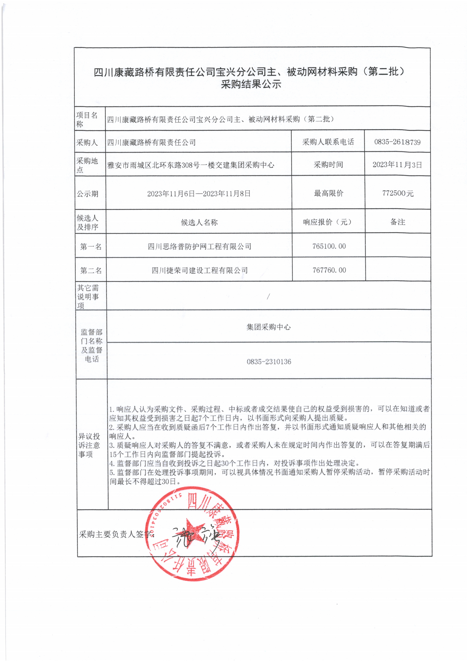 四川康藏路橋有限責(zé)任公司寶興分公司主、被動(dòng)網(wǎng)材料采購(gòu)(第二批)采購(gòu)結(jié)果公示