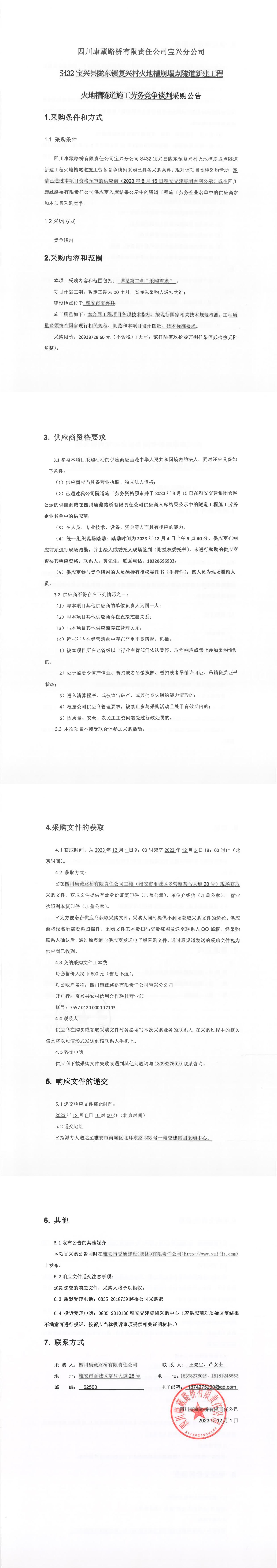 四川康藏路橋有限責(zé)任公司寶興分公司S432寶興縣隴東鎮(zhèn)復(fù)興村火地槽崩塌點(diǎn)隧道新建工程火地槽隧道施工勞務(wù)競(jìng)爭(zhēng)談判采購(gòu)公告
