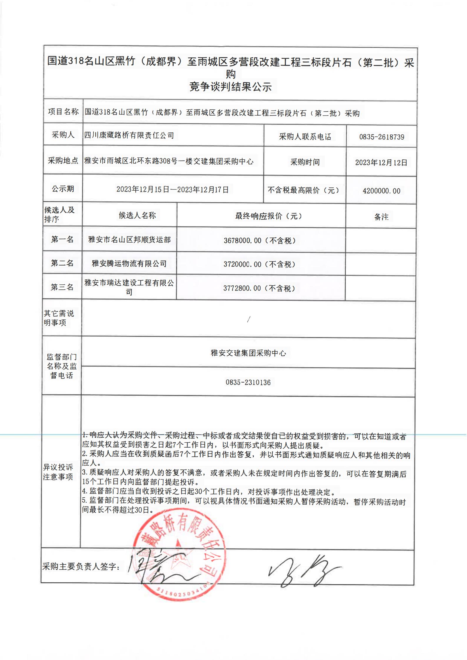 四川康藏路橋有限責任公司國道318名山區(qū)黑竹(成都界)至雨城區(qū)多營段改建工程三標段片石(第二批)采購競爭談判結果