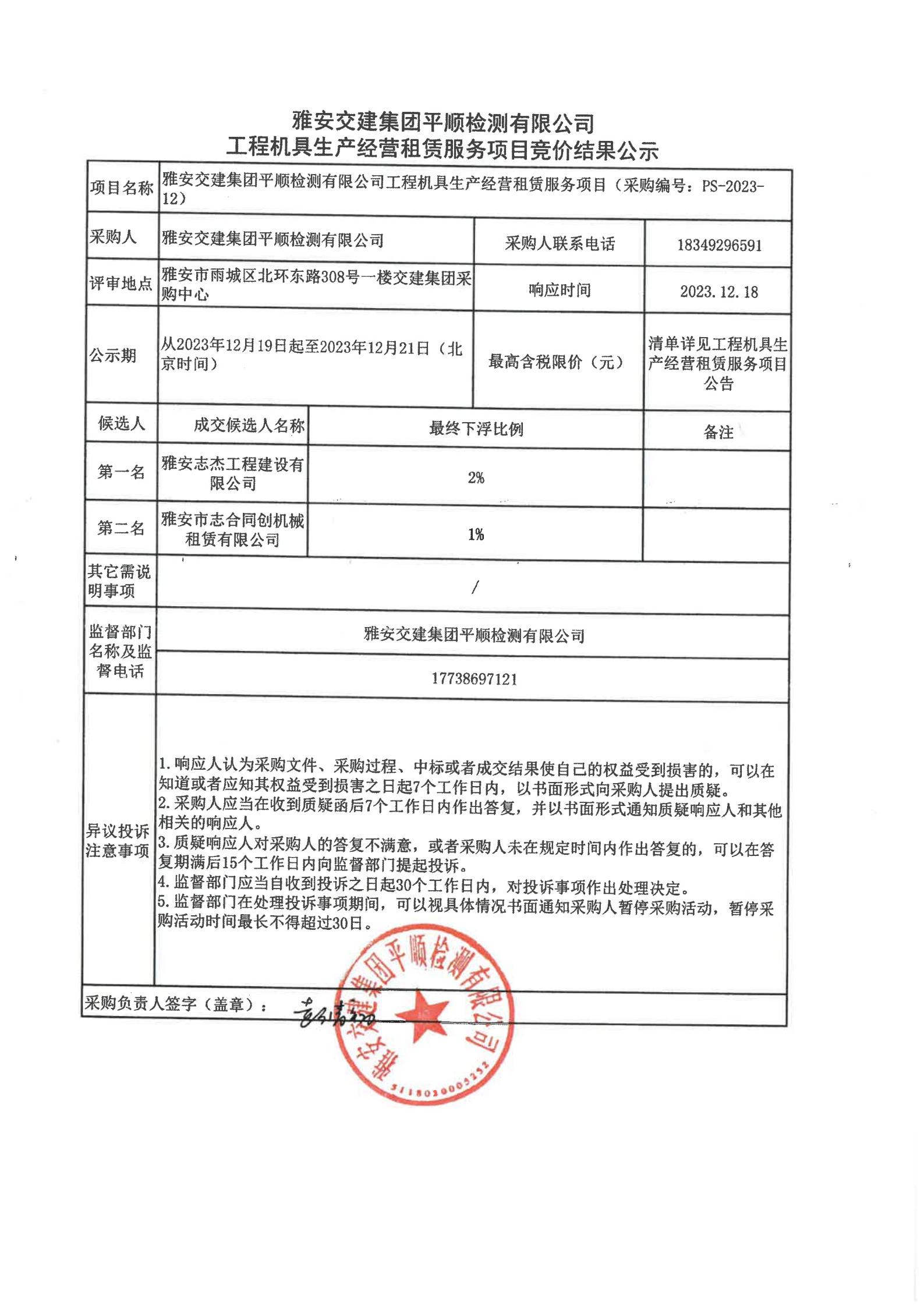 雅安交建集團平順檢測有限公司工程機具生產(chǎn)經(jīng)營租賃服務(wù)項目競價結(jié)果公示